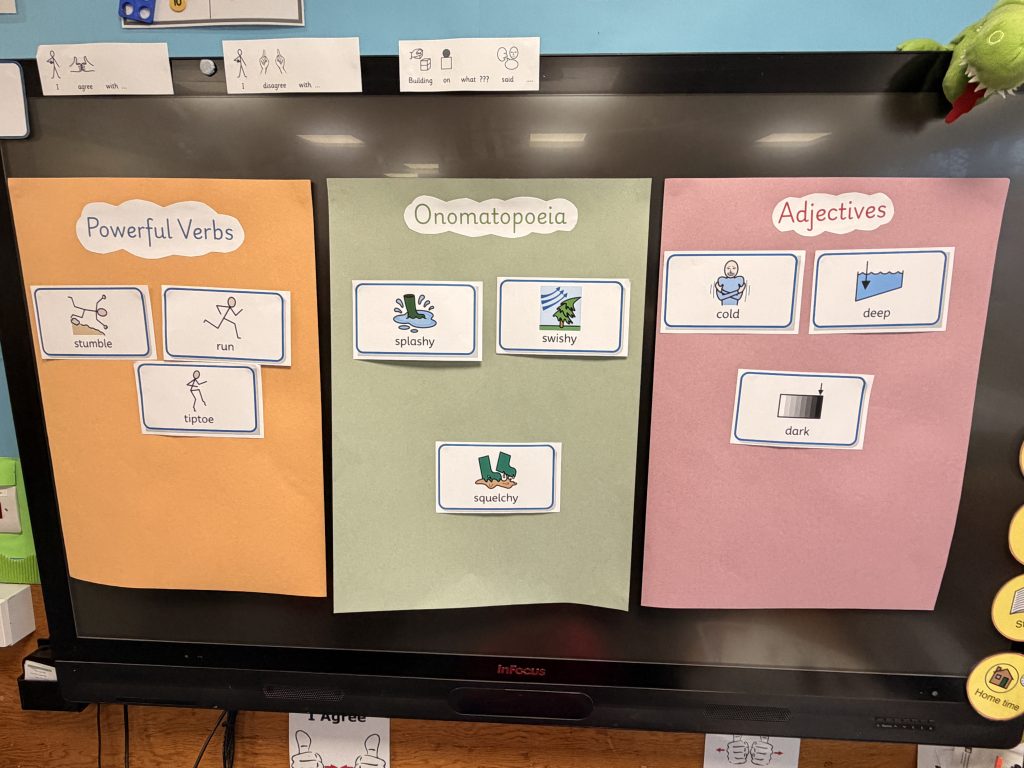 Finally, we zoomed in on some of the powerful vocabulary in the story — words that might help make our own writing exciting and descriptive.