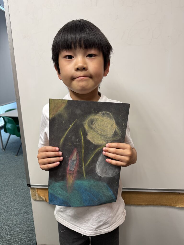 This week Class Six have been working as artists and creating rocket and space art inspired by Peter Thorpe. We worked with the tricky medium of chalk on black paper to create some stunning artwork!