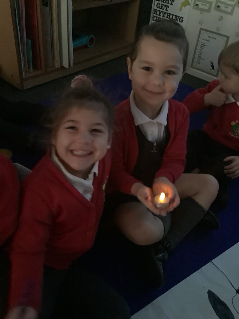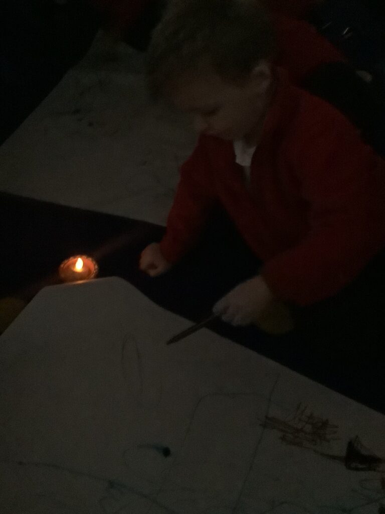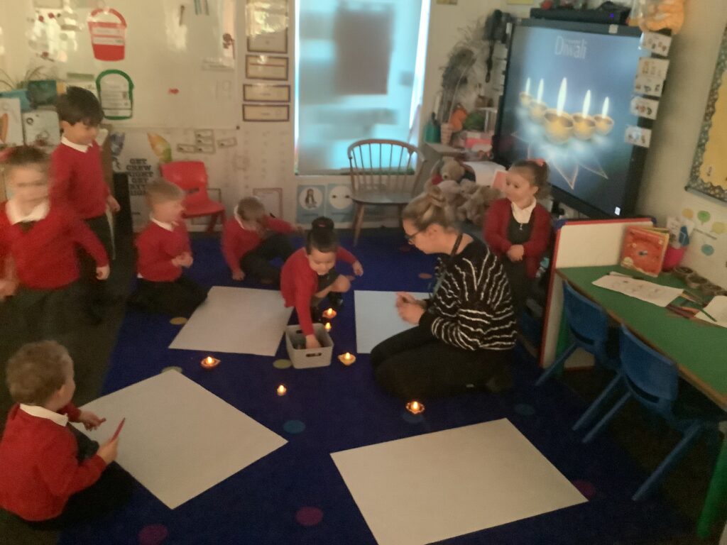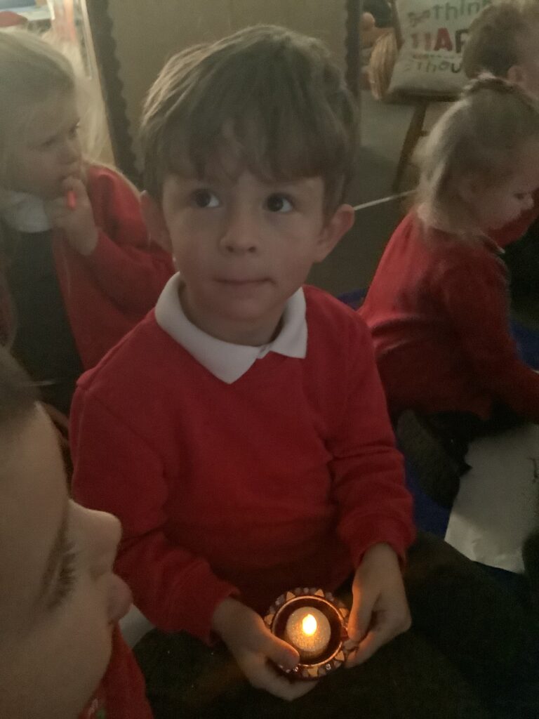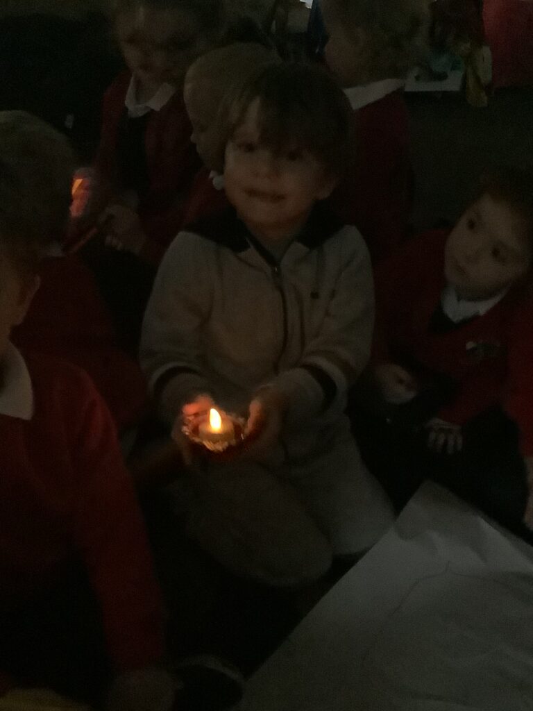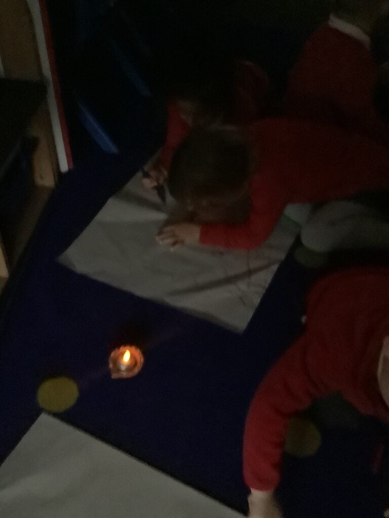 We began the week by hooking the children into Diwali, the Hindu celebration of light, by immersing the children in special Indian music and entering Nursery in the darkness, lit only by Diya lamps. The children were so excited and soothed by the atmosphere as they drew pictures of the diya lamps. They listened carefully to our key text “Binny’s Diwali” by Thrity Umrigar and learned that the lamps are traditional and used as decorations to guide in luck and light and warn off any darkness.