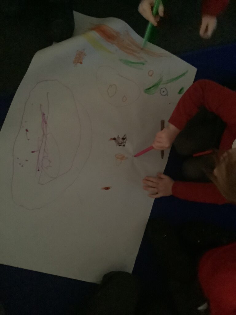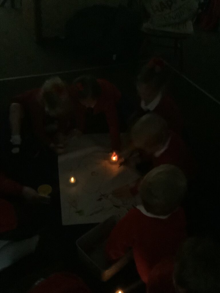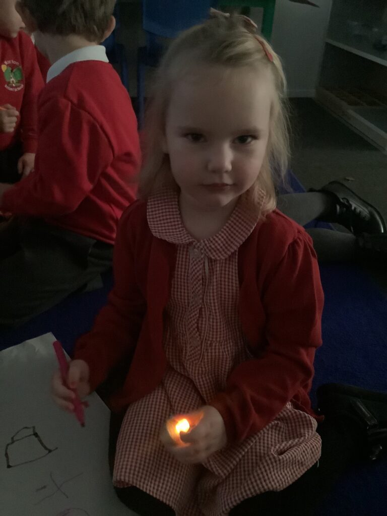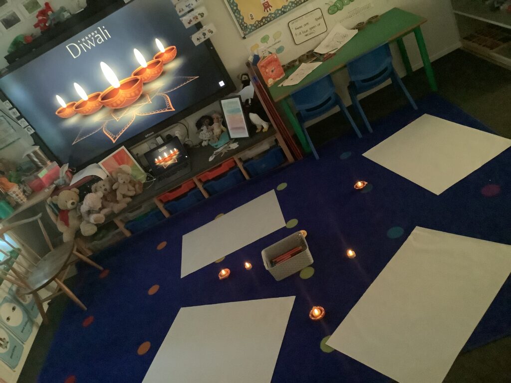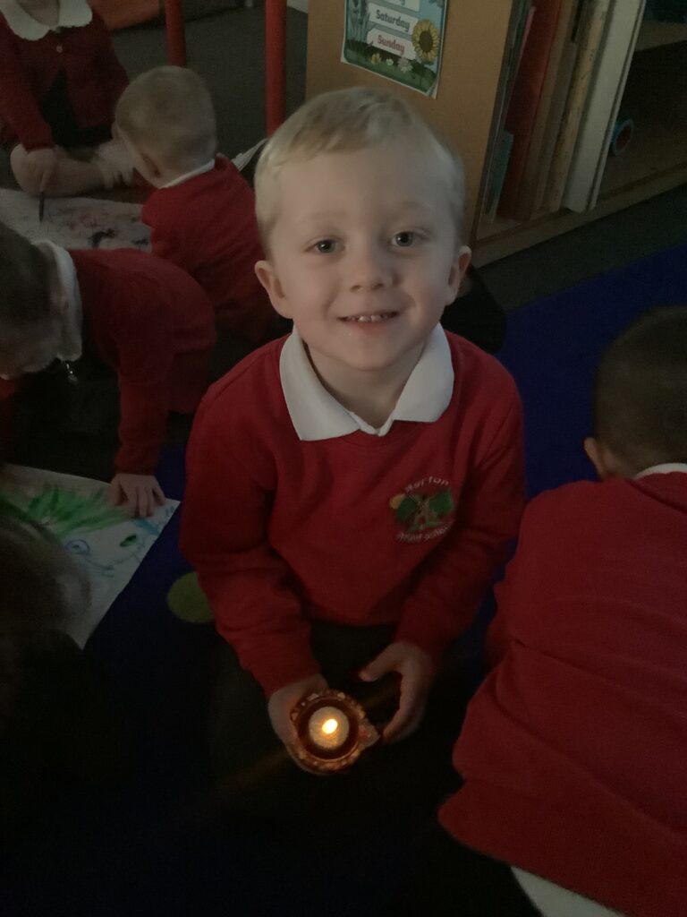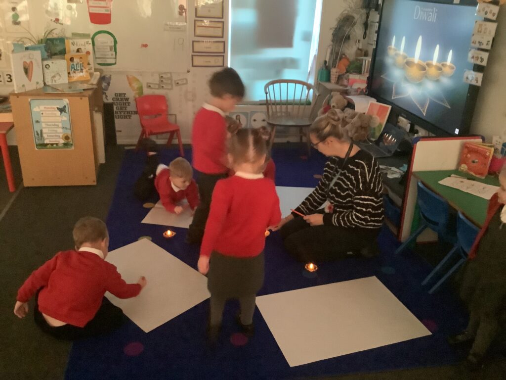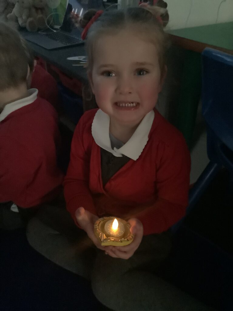 We began the week by hooking the children into Diwali, the Hindu celebration of light, by immersing the children in special Indian music and entering Nursery in the darkness, lit only by Diya lamps. The children were so excited and soothed by the atmosphere as they drew pictures of the diya lamps. They listened carefully to our key text “Binny’s Diwali” by Thrity Umrigar and learned that the lamps are traditional and used as decorations to guide in luck and light and warn off any darkness.
